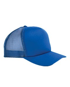 100% cotton twill front panels, mesh back panels. 5-panel. Two front twill panels with foam backing. Plastic closure.